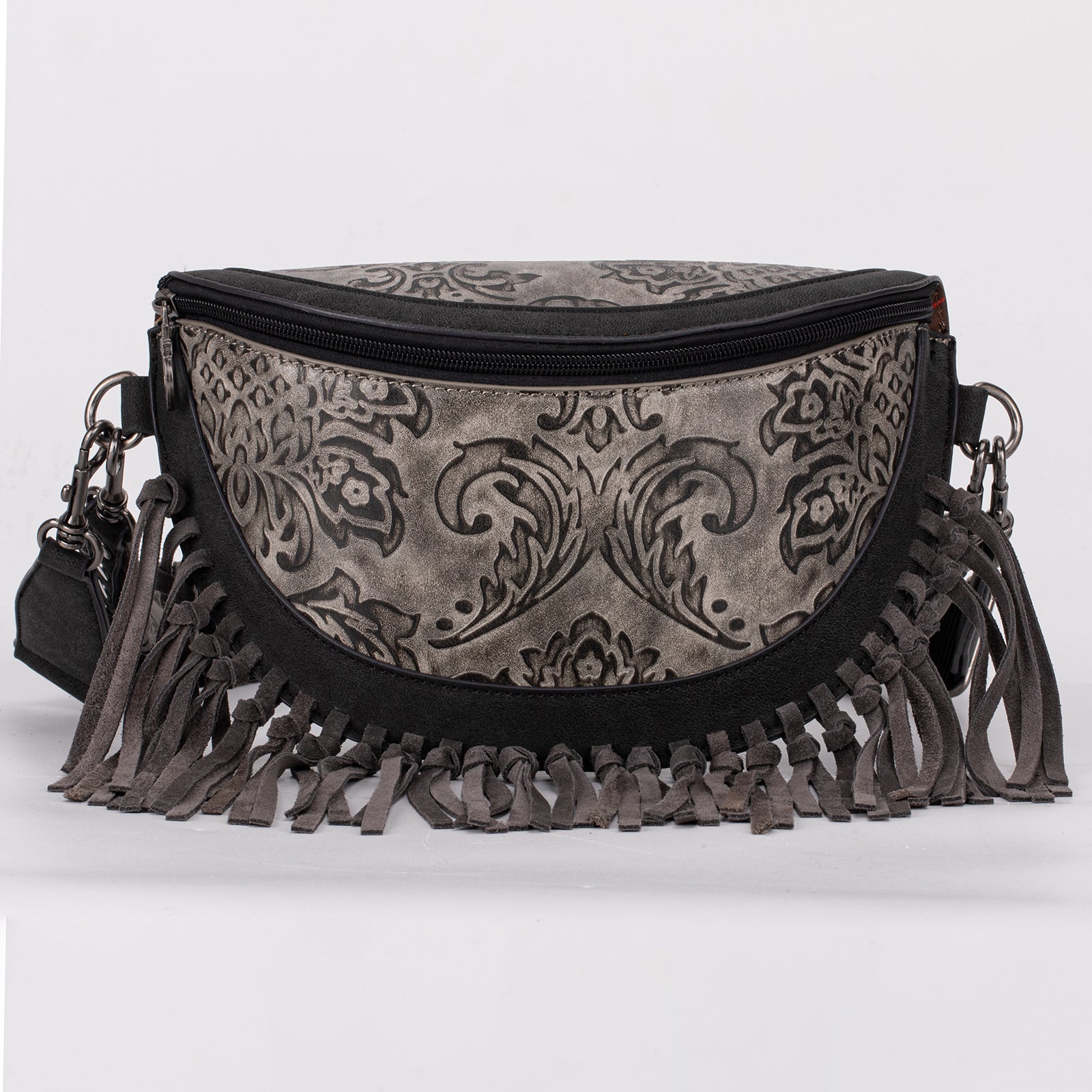 Montana West bum bag features an embossed floral print, hand-tie fringe, and made of PU leather. This convertible crossbody bag has a detachable whipstitch strap (23") and an adjustable and detachable crossbody strap 10" x 3.5" x 7" (Crossbody strap 44").