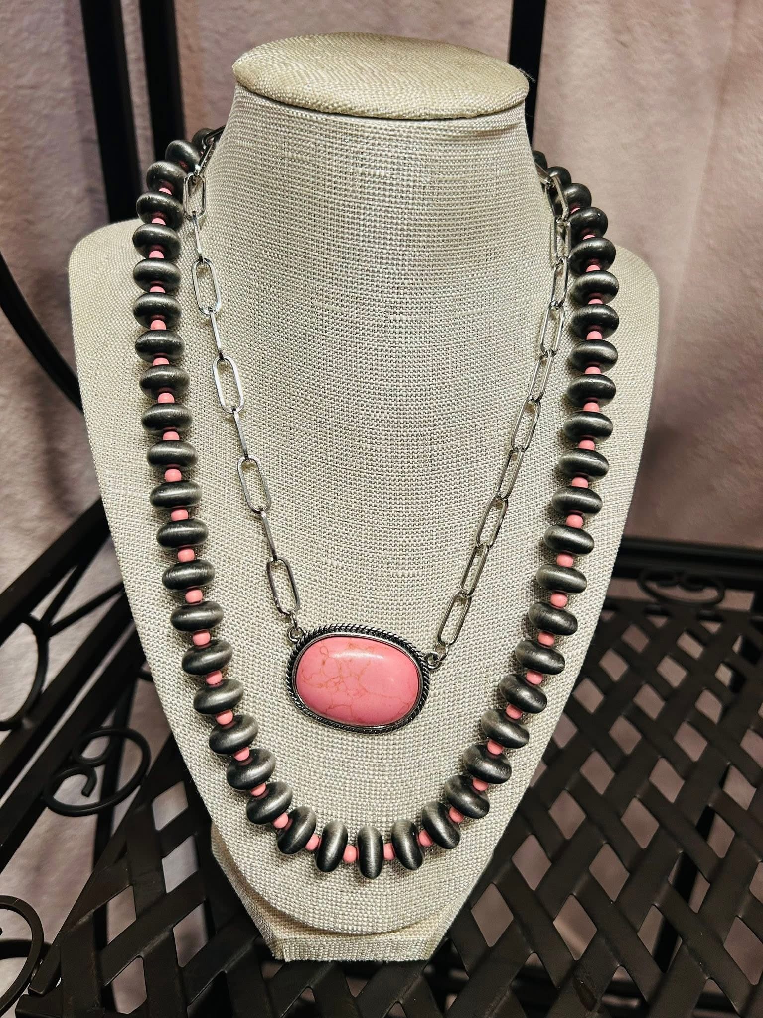 Make a statement with our new western double-layered Helena necklace, showcasing a pink turquoise stone and grey Navajo beads for a refined statement piece.